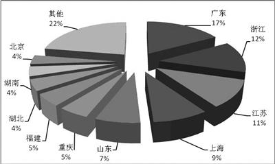 2013年度旅行社国内旅游组织人次排名前十位的省份依次为广东、浙江、江苏、上海、山东、重庆、福建、湖北、湖南、北京。(见图1)