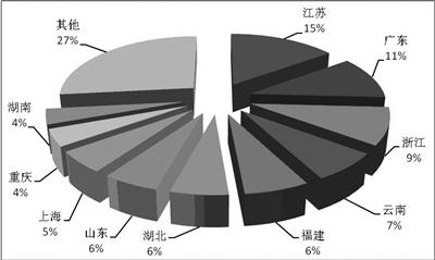2013年度旅行社国内旅游接待人次排名前十位的省份依次为江苏、广东、浙江、云南、福建、湖北、山东、上海、重庆、湖南。(见图2)