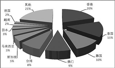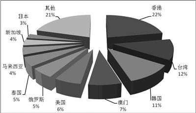 2013年度旅行社入境旅游接待人次排名前十位的客源地国家和地区依次为香港、台湾、韩国、澳门、美国、俄罗斯、泰国、马来西亚、新加坡、日本。(见图5)
