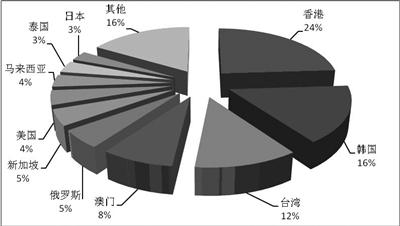 2013年度旅行社入境旅游外联人次排名前十位的客源地国家和地区依次为香港、韩国、台湾、澳门、俄罗斯、新加坡、美国、马来西亚、泰国、日本。(见图4)