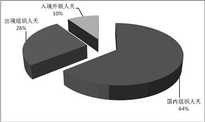 以国内组织人天、出境组织人天、入境外联人天三项指标数据进行比较,2013年度全国旅行社国内旅游、出境旅游、入境旅游所占份额分别为64%、26%、10%,分别同比减少5个百分点、增长6个百分点、减少1个百分点。(见图7)