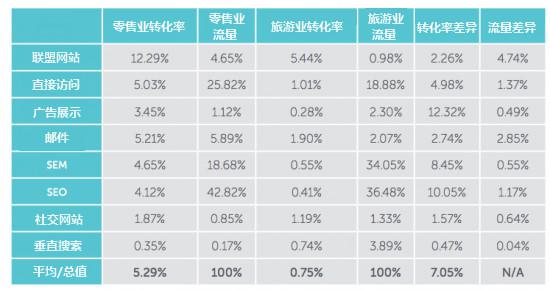 • 零售业转化率为5.9%,而旅游业仅为0.75%